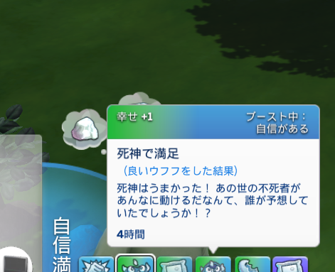 ブロックパーティーとは全然違うセーブデータでやってたんですが(ガーデニングと料理とグルメ料理スキルがマックスのシムがいたので)、水曜になるまで死神と戯れて遊んでいたらいつの間にか恋愛ゲージを生やしてしまい、試しにウフフに誘ってみたら普通にできたうえになんか生々しい感想文が出てきてめっちゃ笑いました。